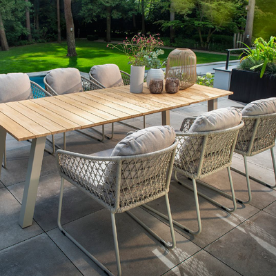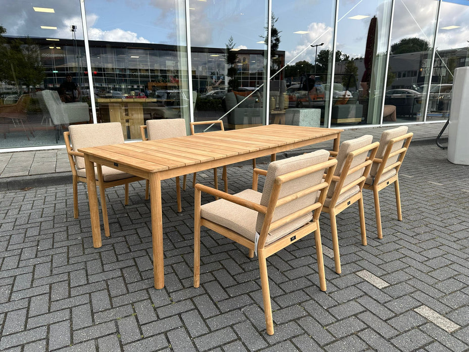 Een elegante combinatie van natuurlijk teak en comfortabele kussens: de Yoi Mare dining set is perfect voor buiten dineren in stijl.