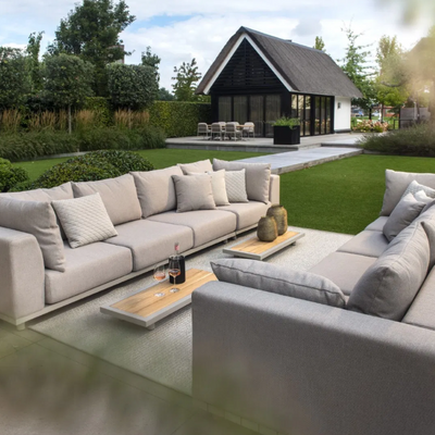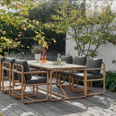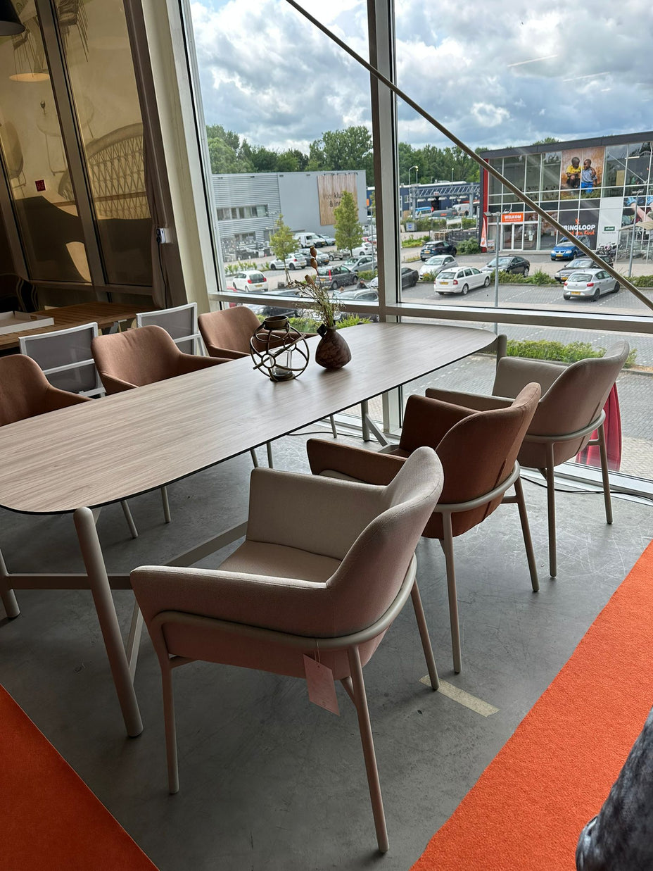 Strak, modern en uitnodigend: de Yoi Vedella dining set combineert een aluminium tafel met zes comfortabele Take dining stoelen. Perfect voor stijlvolle diners in de buitenlucht.